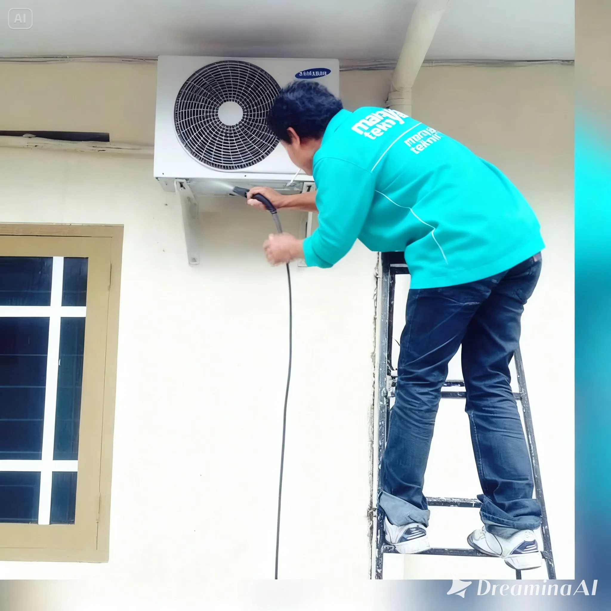 Pembersihan AC indoor dan outdoor untuk menghilangkan debu dan kotoran. Jenis pekerjaan disesuaikan dengan kondisi unit AC.